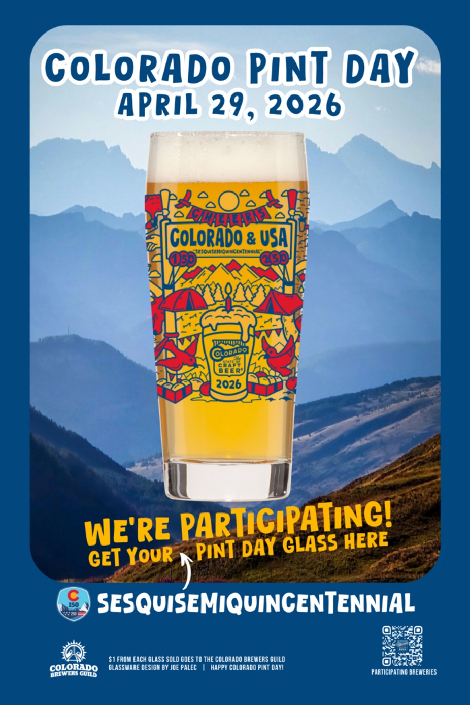 “Cheers to CO 150th & USA 250th Celebrations” Colorado Pint Day is a time-honored tradition that has reached cult-level status with beer lovers flocking to participating breweries every year to purchase Colorado Pint Day limited edition glassware. $1 of each pint glass sold will be donated to the Colorado Brewers Guild and its mission to promote, protect and propel independent craft breweries in the State of Craft Beer.