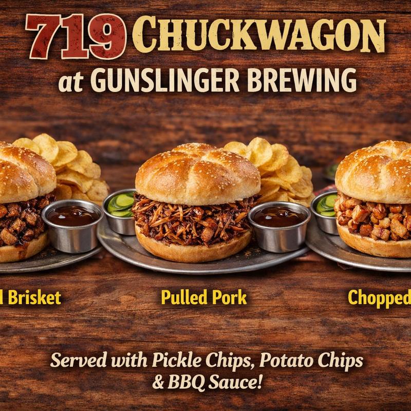 We've partnered with Chuckwagon 719 to bring you pulled pork, chopped brisket, and pulled chicken sandwiches on *Tuesdays*! Served with a side of potato chips, pickle chips, and BBQ sauce, you can get the Springs best BBQ with your favorite Gunslinger beers! Get it while it lasts!