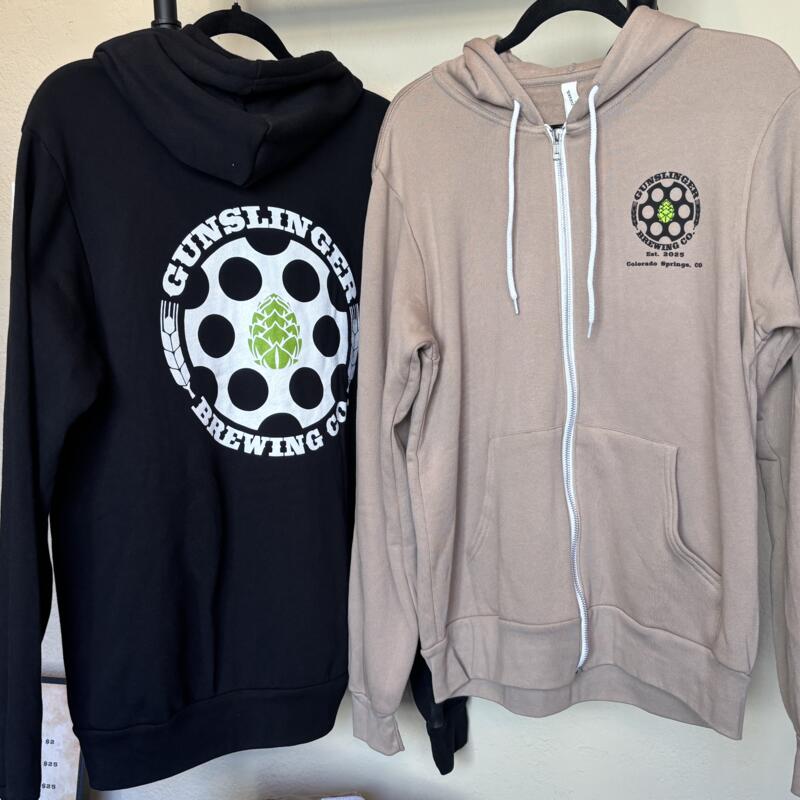 Soft cotton zip-up hoodies, available in Black and Tan.