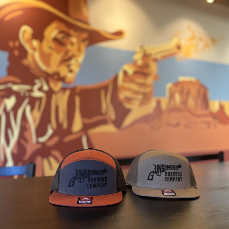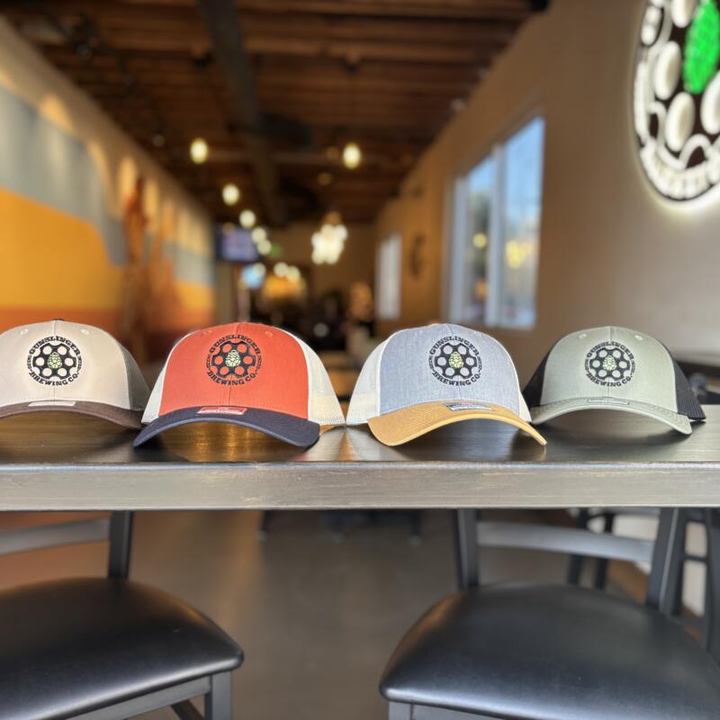 Snap-back trucker hats with the Gunslinger logo, available in Khaki, Orange, Blue, and Olive.